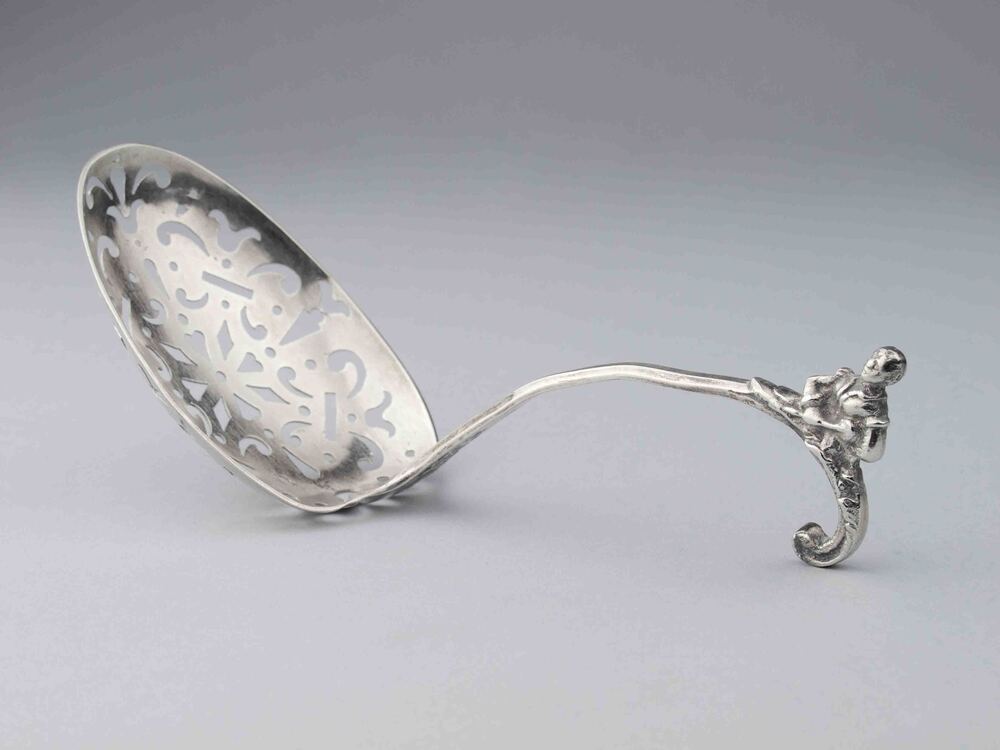 Suikerstrooier met bovenop de krul van de steel een vrouwenfiguurtje ten halve lijve, onder de linkerarm een rommelpot houdend