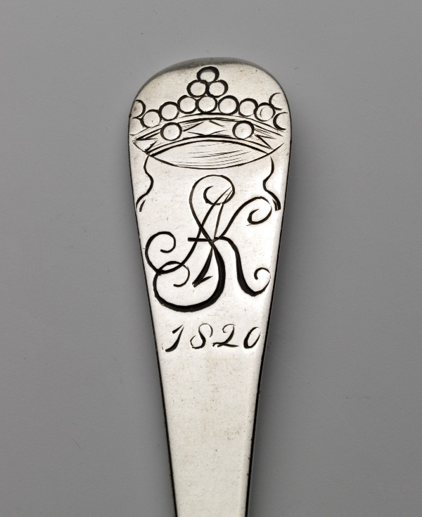 Vork met achterop de steel een monogram gegraveerd, bestaande uit letters ASK