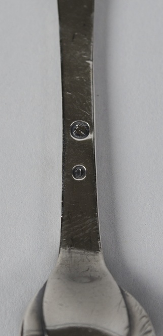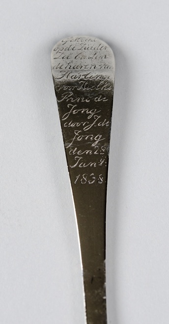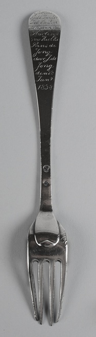 Gedachtenisvork met achter op de steel, bovenaan, gegraveerd in handschrift: Gekocht/op de Zuider/Zee buiten/de haven van Harlinge/voor Hielke/Prins de/Jong/door J.de/Jong/den 28/Jan.ij:/1838