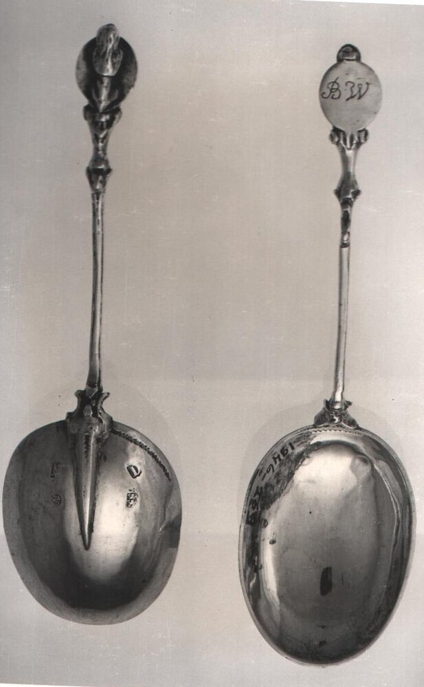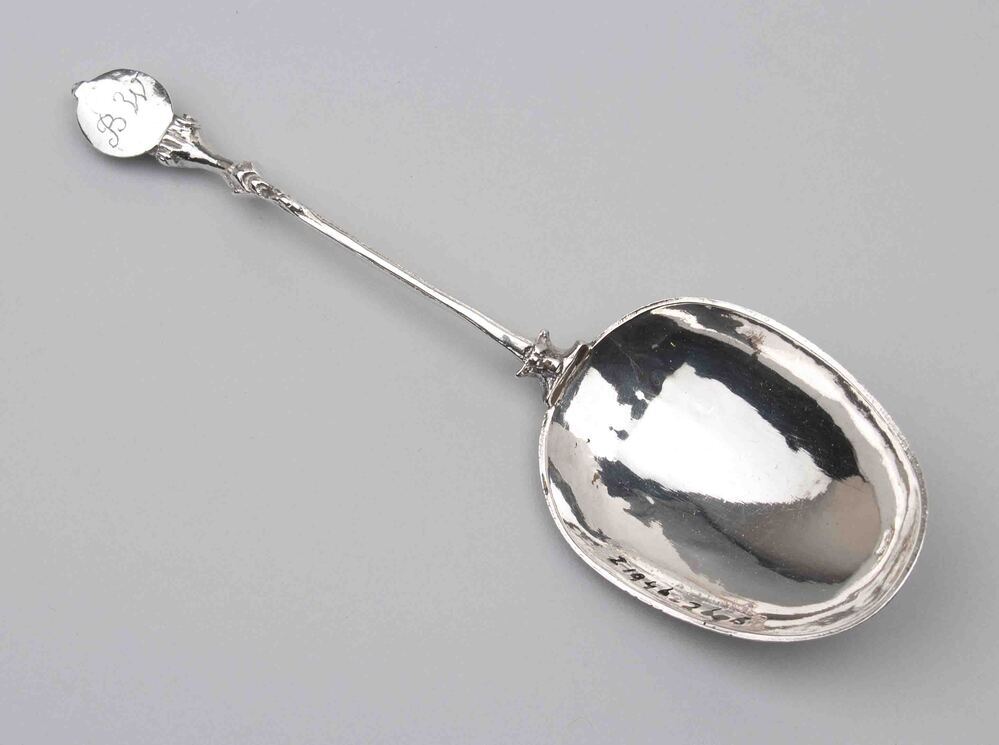 Lepel met als bekroning een opzittende leeuw met de voorpoten een ovaal schild vasthoudend