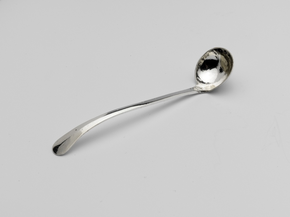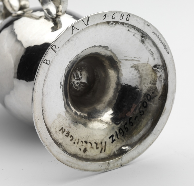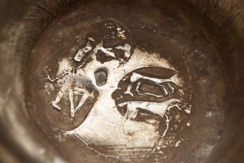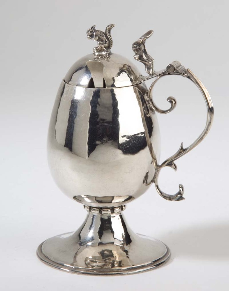 Mosterdpotje met lepel en afbeelding van twee sterk gestyleerde met elkaar verbonden haasjes