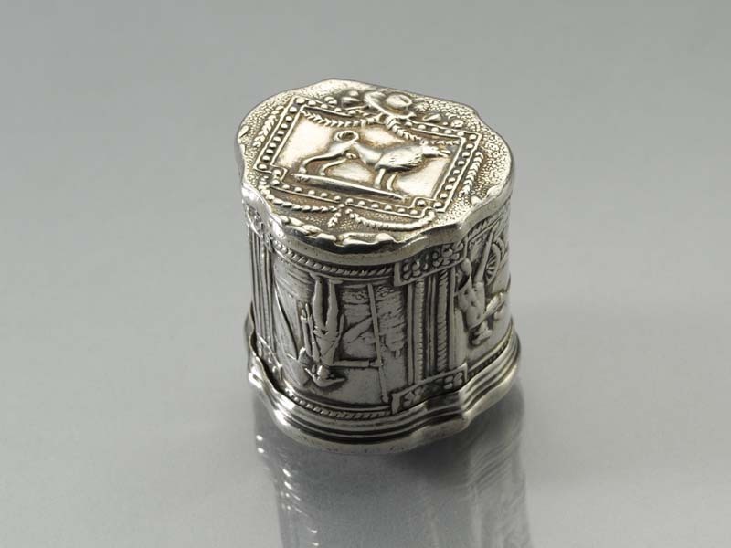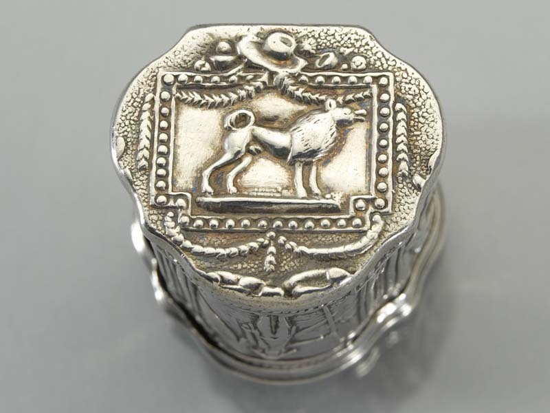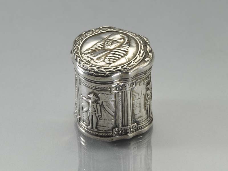 Loddereindoosje met op deksel portret van man met pruik op en op bodem een staande keeshond