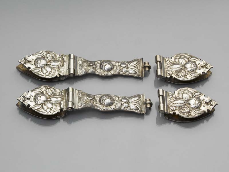 Het geheel van (edel)metalen, geornamenteerde bescherm- en/of versierstukken op kostbare boeken. De delen (kunnen) zijn: de hoeken, een centraal middendeel, klamphouders en klampen en een houder met ring middenboven voor een draag- of vergrendelingsketting.