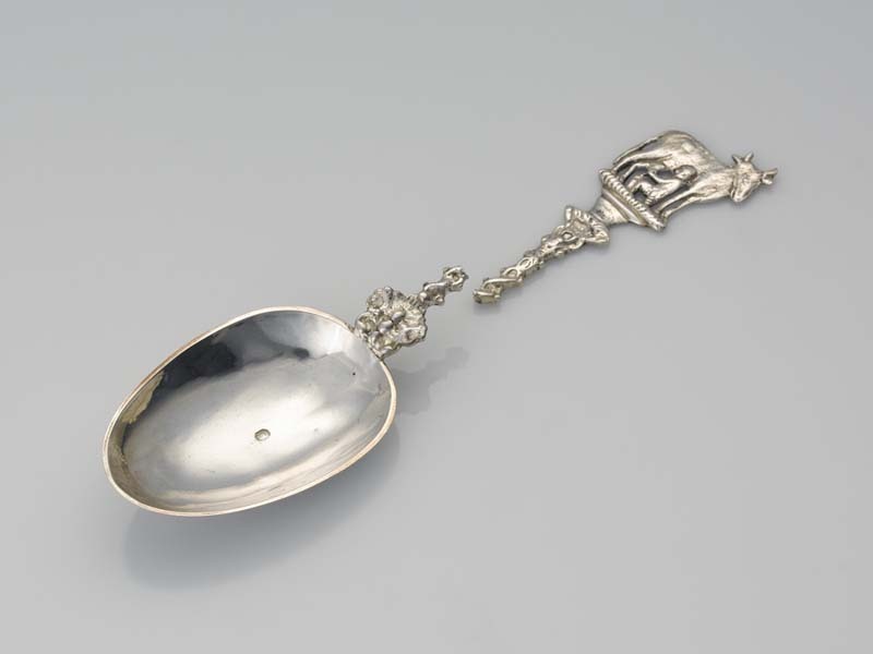 Gedachtenislepel met onderaan symmetrische rankwerk, met palmet en twee griffioenskoppen, bovenaan runderkop