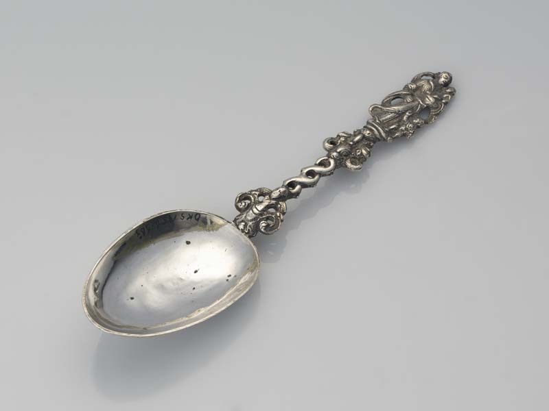 Geboortelepel met bekroning met staande vrouwenfiguur met twee kinderen, voorstellende Liefde