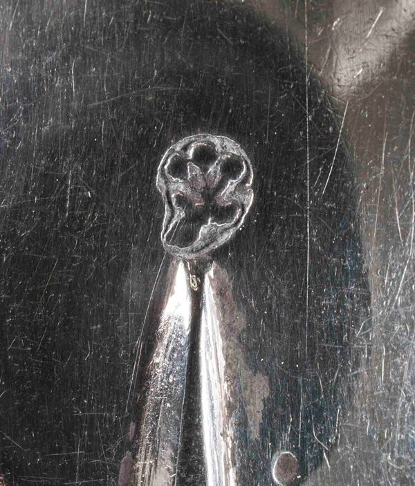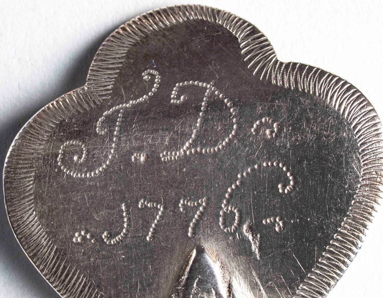 Lepel met boven bloemkelk vrouwenfiguur ten halve lijve, linkerhand tegen voorhoofd houdend