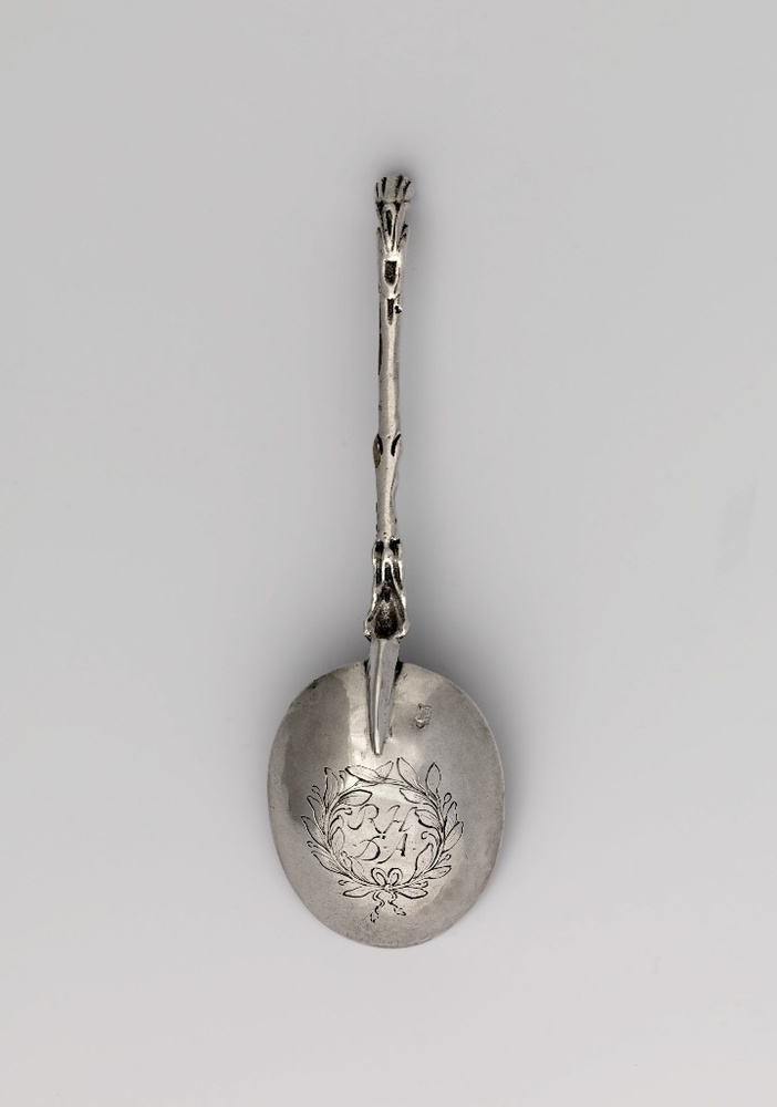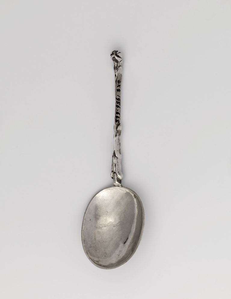 Lepel met gegoten ornament; steel, driehoekig in doorsnee, versierd met kwabornament