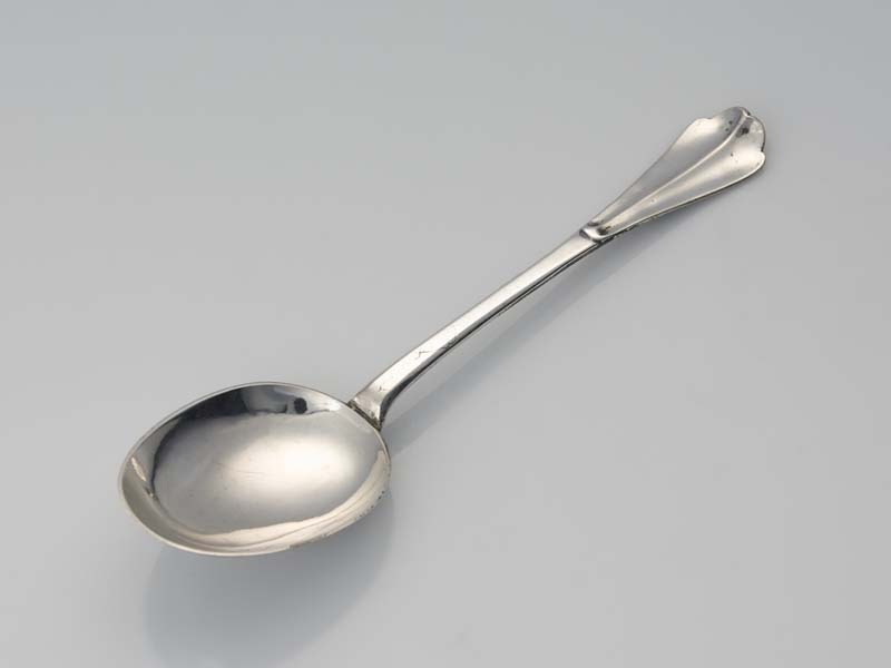 Lepel waarvan bovenstuk steel boven toe breder uitloopt en is afgewerkt als palmet en krult even naar voren om