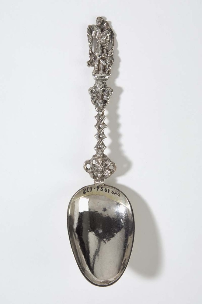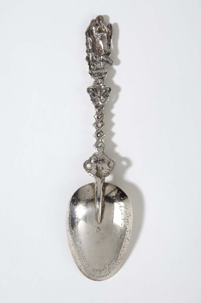 Gedachtenislepel met bekroning van vrouwenfiguur, staande op kapiteel, met twee kinderen waarvan een op arm, voorstellende Liefde