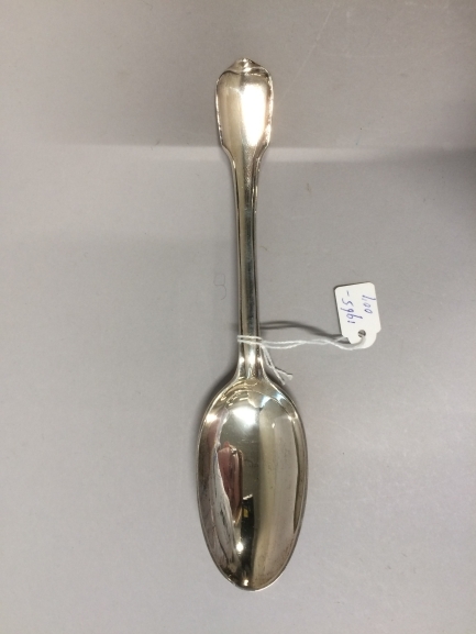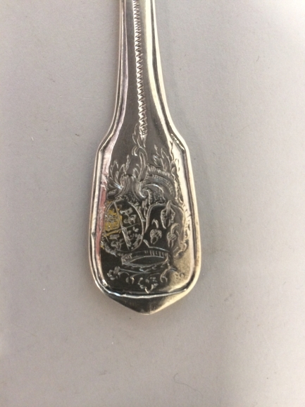 Een van drie zilveren lepels uit couverts met alliantiewapens Sixma en van Burmania onder een kroon