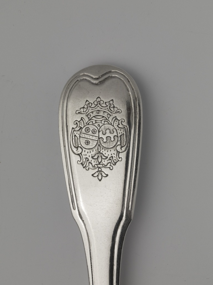 Twaalf zilveren vorken in mahoniehouten cassette met alliantiewapen Rengers-Van Welderen