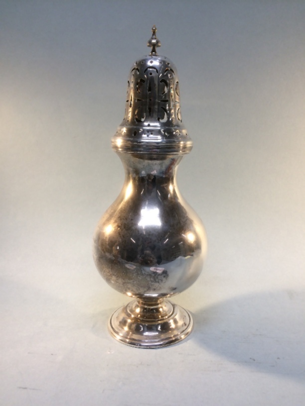 Een van twee zilveren suikerstrooiers met gegraveerde inscriptie
