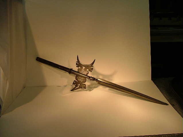 Hellebaard met een lange punt en een afgebroken steel. De bijl heeft de vorm van een maan met twee spiegelbeeldige draken. De haak is in de vorm van een spiegelbeeldige Sint Joris. Onder de punt bevindt zich een rozetvormige knop. Herkomst onbekend. Hellebaarden waren bedoeld als wapen en werden gebruikt door Hellebaardiers. Het bestaat uit ...
