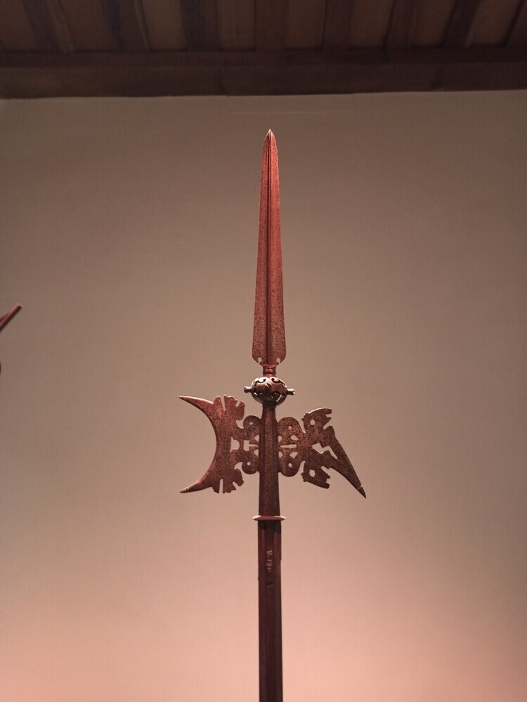 Hellebaard met een lange punt op een houten steel. De bijl heeft de vorm van een maan. De haak is in de vorm van een spiegelbeeldige Sint Joris. Onder de punt bevindt zich een bewerkte knop. Hellebaarden waren bedoeld als wapen en werden gebruikt door Hellebaardiers. Het bestaat uit een lange stok, met daarop een ...