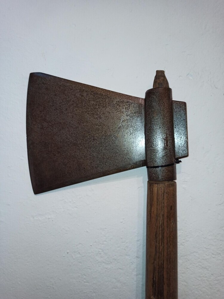 Lange bijl met metalen knop onder aan de steel. Drie cirkeltjes boven elkaar en 'Delft', ingeslagen bij de schacht. Op de stamkaart: Waarschijnlijk afkomstig wuit de toren te Gorinchem.