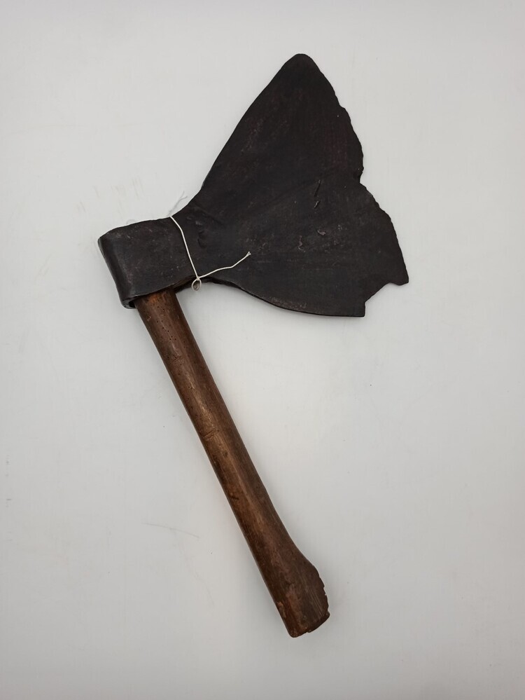 Wigvormige bijl van ijzer met een ronde houten steel. Het blad is met behulp van een losse wig aan de steel vastgezet. Op de stamkaart: aan linkerzijde inscriptie uitgestoten. Snijvlak vertant flinke deuk.
