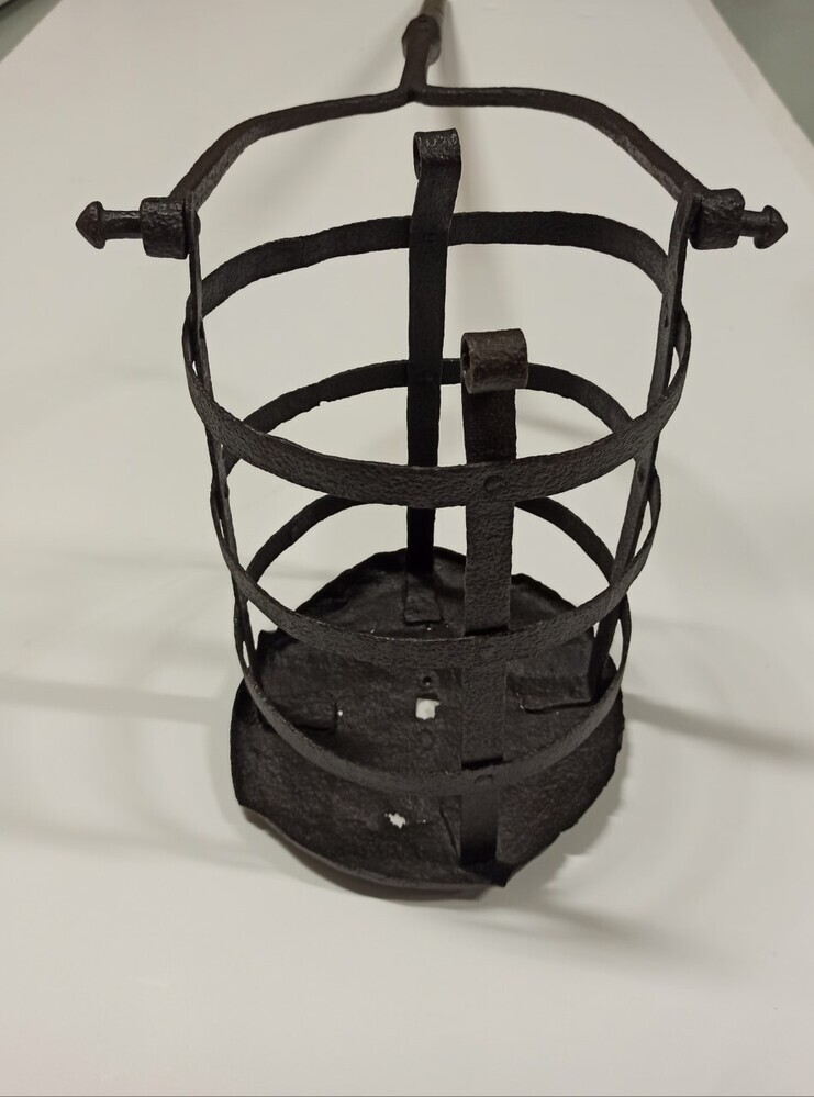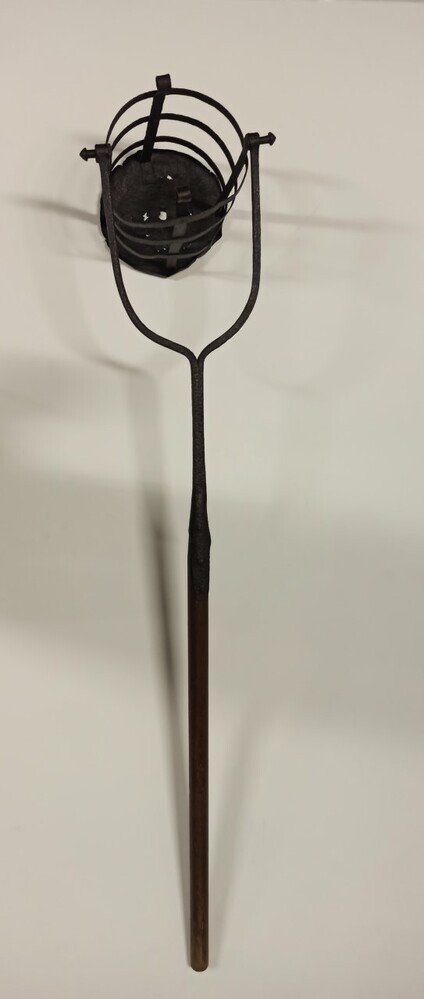 Lange ijzeren stang met een speerpunt aan het uiteinde. Hieraan hangt een ijzeren korfje met daarin een pekstaaf.