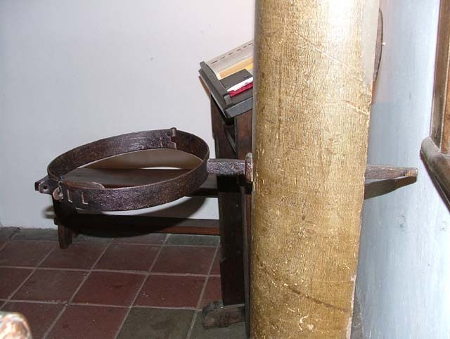 Lijfbeugel met een rechte stang en een verstelbare beugel met drie langwerpige openingen waardoor de halfronde sluiting valt. De beugel heeft een scharnier en is met een nagel aan de de stang bevestigd. Op de stamkaart: Macht uit oorspronkelijk [...] uit v. Schandpaal; hier hoort een lijf. beugel in die in de stang een opening ...