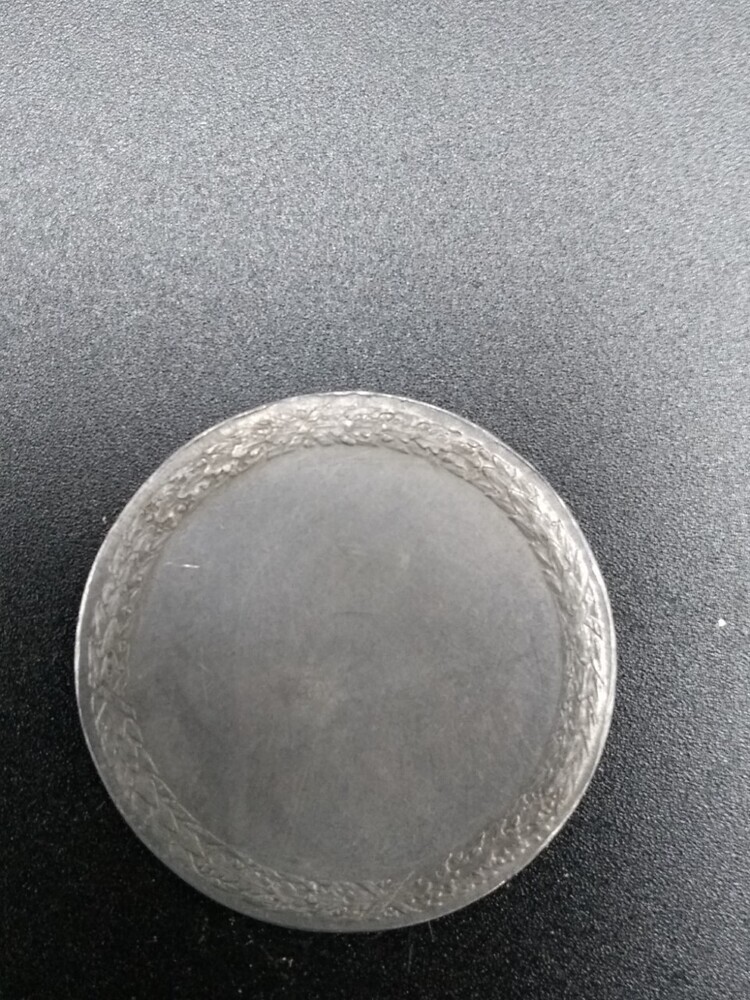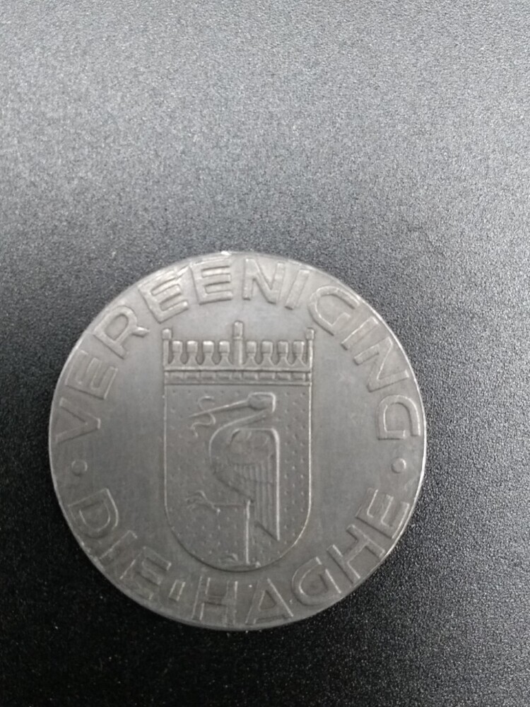 VZ: Het gestyleerde stadswapen van Den Haag (naar links gewende ooievaar) met omschrift: VEREENINGING DIE HAGHE. KZ: Binnen de omlijsting van twee van twee lauwer- en eikentakken is er ruimte voor inscriptie.