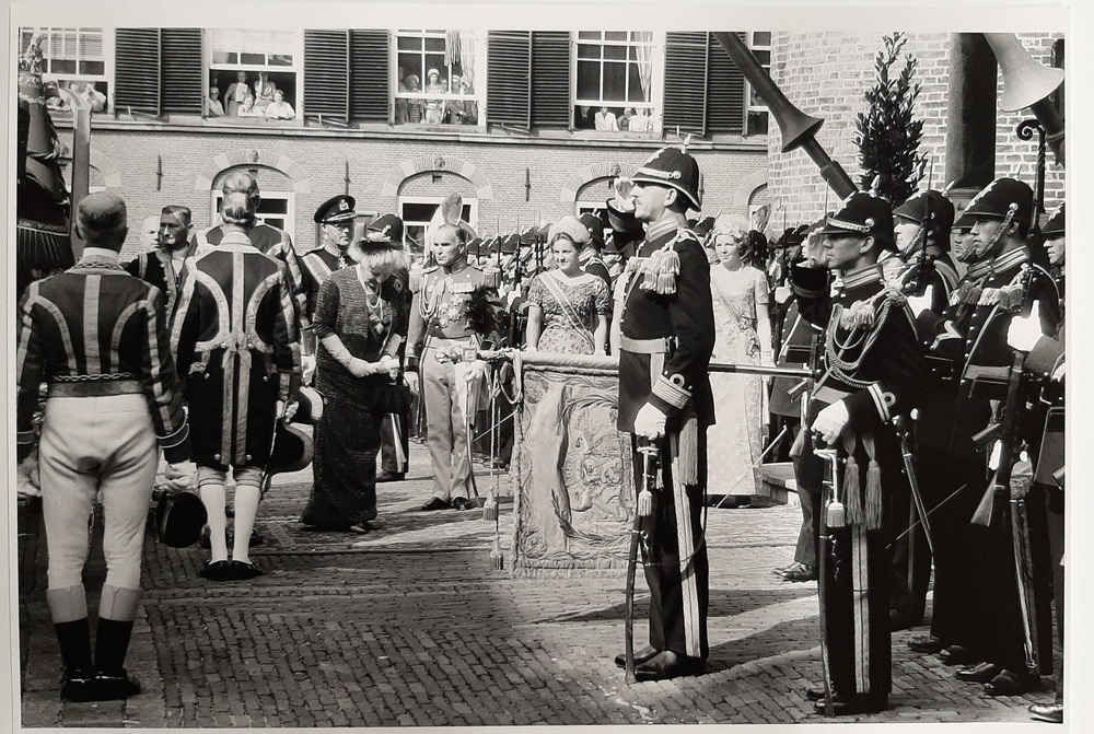 Koningin Juliana begroet het vaandel bij haar aankomst voor de Ridderzaal op Prinsjesdag
