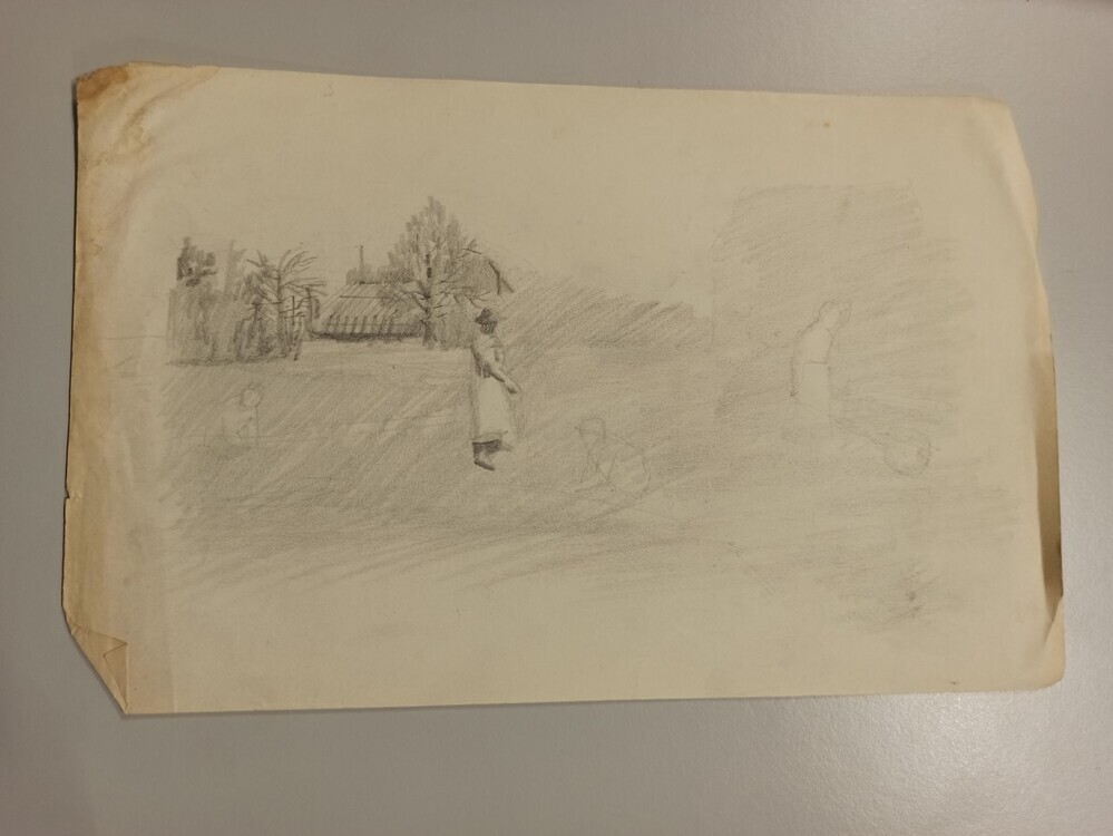 Schets van een weiland met zaaiende figuren