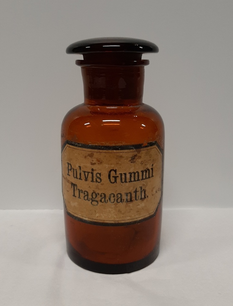 Apotheresfles met dop in bruin glas. Centraal zit een groot etiket met zwarte rand waarop staat "Pulvis Gummi Tragacanth.". In de fles zit het witte poeder. Tragacanth of tragacanthgom is een natuurlijke gom, afkomstig is uit de boomstam van de Astragalus gummifer, die groeit in Iran, Syrië en Turkije. Het is een van de oudste ...