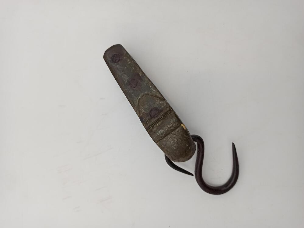 Katrol of takel van ijzer waarin vijf rollen zijn geklonken. Aan de katrol een s-haak. Op de stamkaart: Onderdeel v.d. rekpaal? deel v. inventaris gevangenis museum of [...] depot?