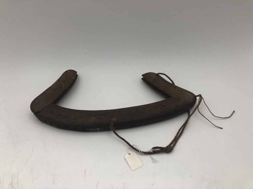 C-vormige eikenhouten bijlhouder, met scharnierend deel om het blad van de bijl te kunnen plaatsen. Het blad valt in een groef. Deze beschermer past bij de bijl met inventarisnummer 297. Op de stamkaart: Met er aan vast 2 polijstkussentjes.