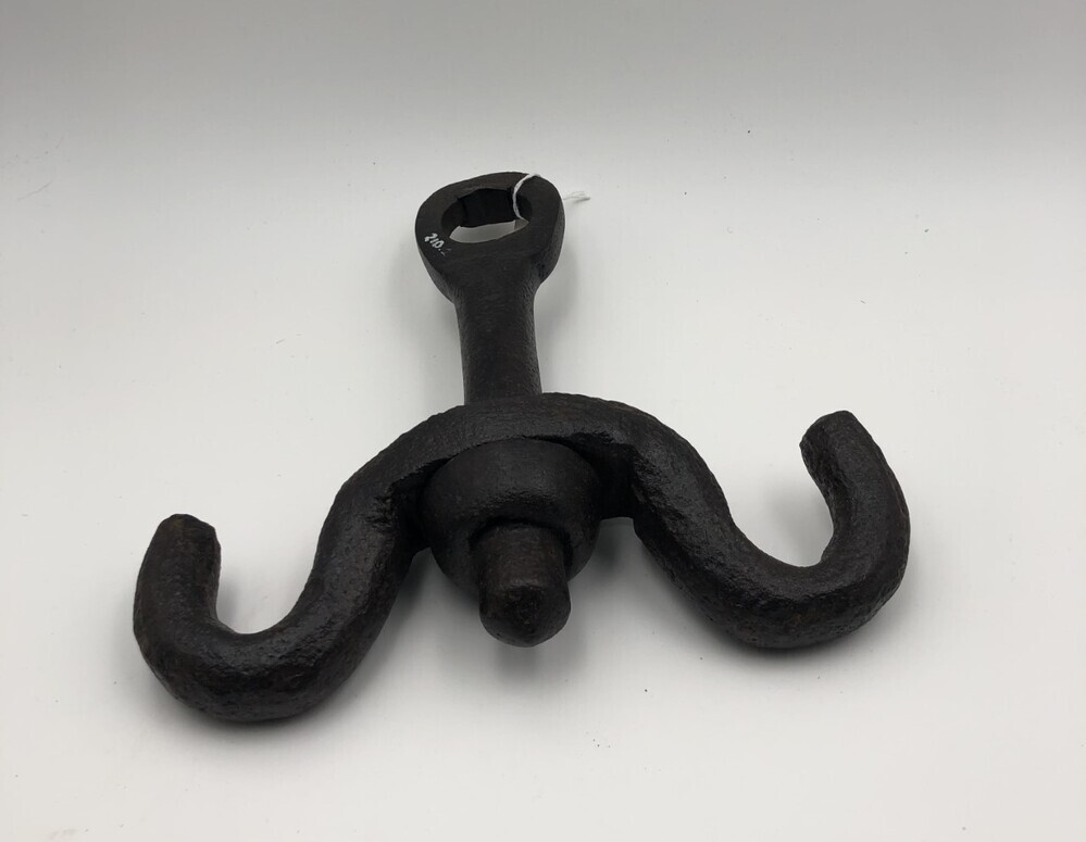 Ronde pen van ijzer met een oog aan het uiteinde. De pen steekt in een gebogen stuk ijzer dat is vastgezet met een ijzeren ring.