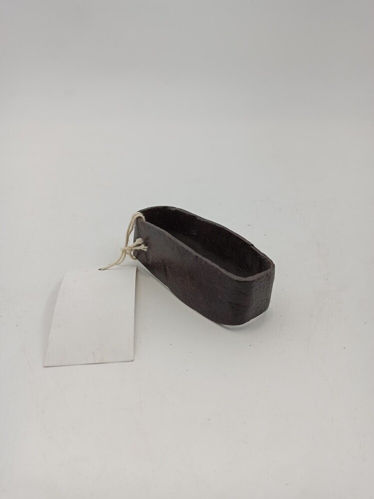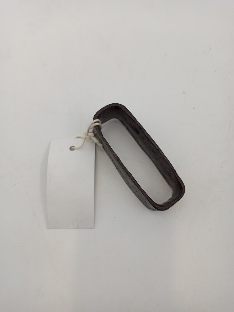 Ovale ijzeren ring, vervaardigd uit een band waarvan de uiteinden aan elkaar zijn geklonken. Op de stamkaart: gebroken schakel hoort bij ketting 100 en haak 226. (inmiddels in pijnkelder). Waarschijnlijk [...]. Voet en lijfbeugels. Dit is een ovale ring van metaal h 3.6 x bg 5 x d 3.3.