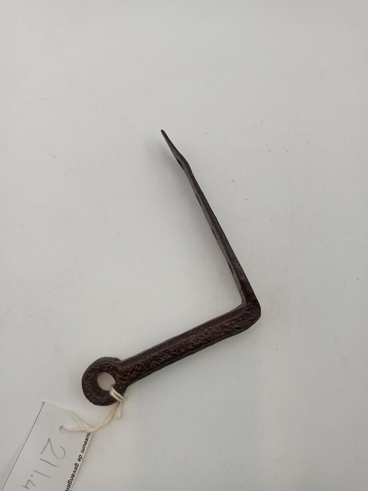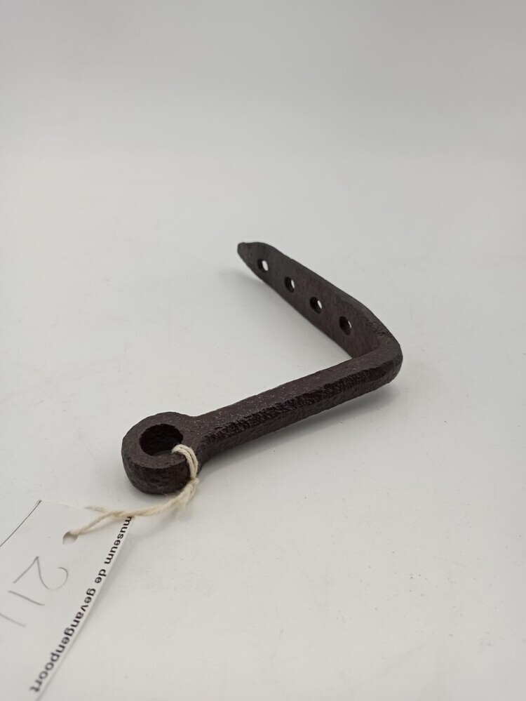 L-vormige haak van ijzer met vier gaten en een oog. Op de stamkaart: gebroken schakel hoort bij ketting 100 en haak 226. (inmiddels in pijnkelder). Waarschijnlijk [...]. Voet en lijfbeugels. Dit is een muuranker 16.2 x 3.3. x 13.0.