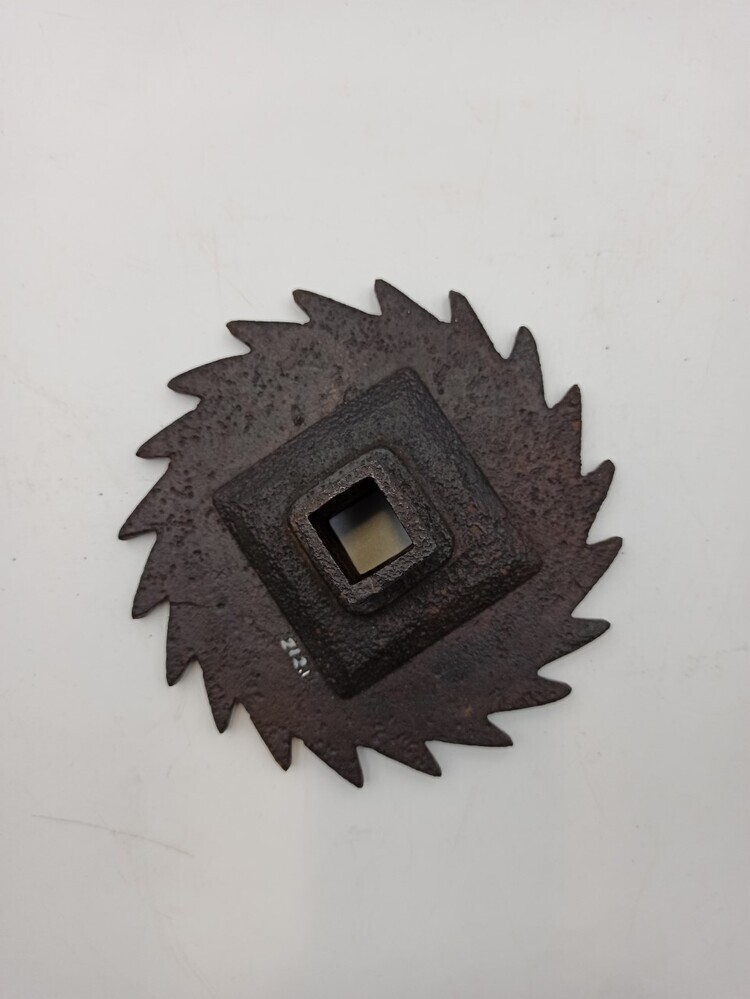 Tandwiel met weerhaken en in het midden een vierkante opening, die aan de achterzijde uitkomt in een vierkante buis, vastgezet op een vierkante ijzeren plaat. Dit is een onderdeel van een draailier. h 6.8 x diameter 17.8.
