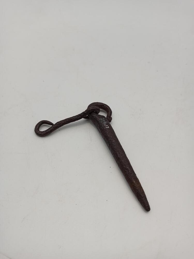 Taps toelopende pin met omgebogen oog. Daaraan een dunner haakje met omgebogen ogen. Op de stamkaart: pin. h 17.7 x 2.8 x 1.3.