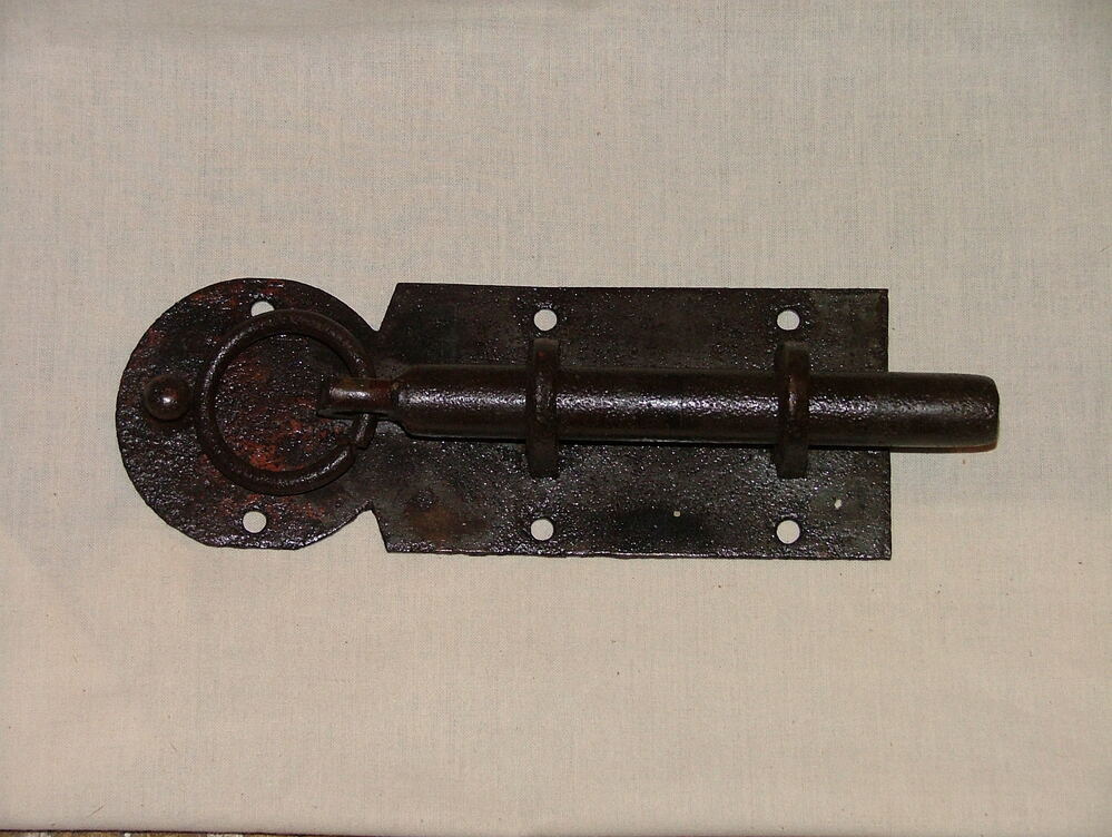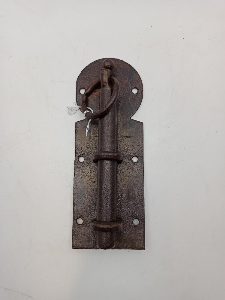 Slotpen van ijzer op een rechthoekig slotplaatje met cirkelvormig uiteindel. Op de stamkaart: deurklink 23.2 x 7.5 x 4.4.