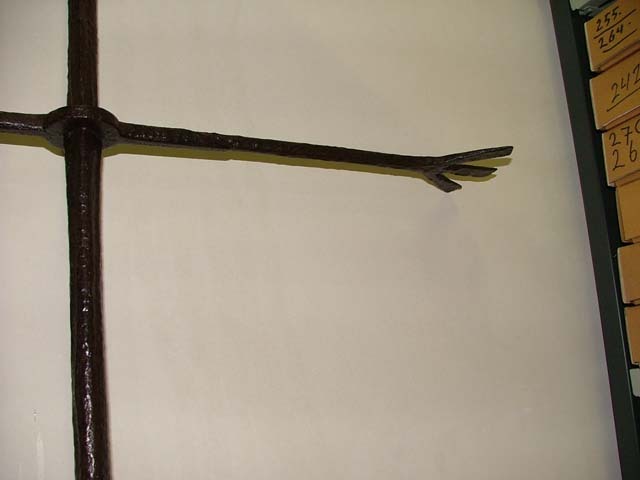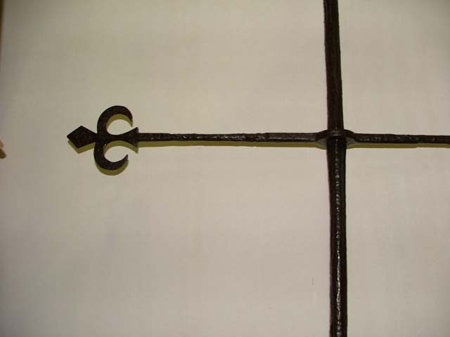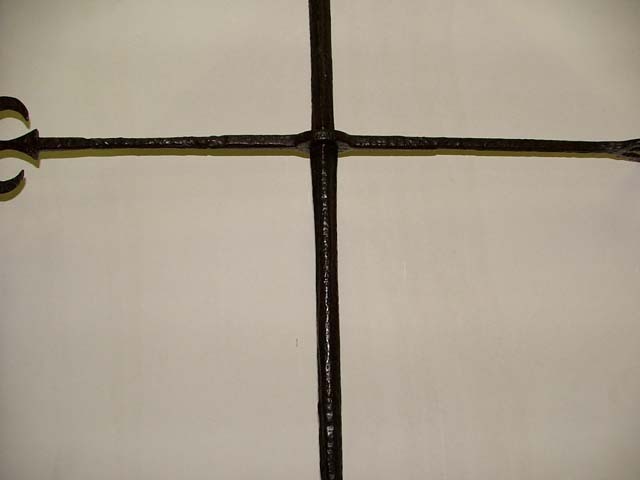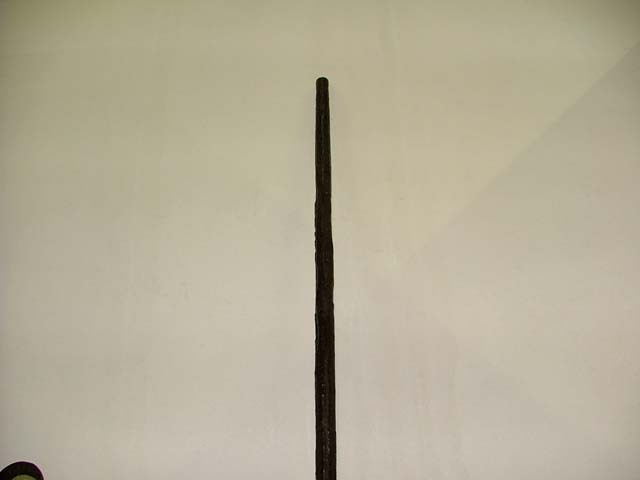 Metalen windvaan, met een lange staaf waaraan een lange pijl dwars in gemonteerd. De staaf staat op een aan de onderzijde gemonteerde smalle metalen band met aan weerszijden een rond gat.
