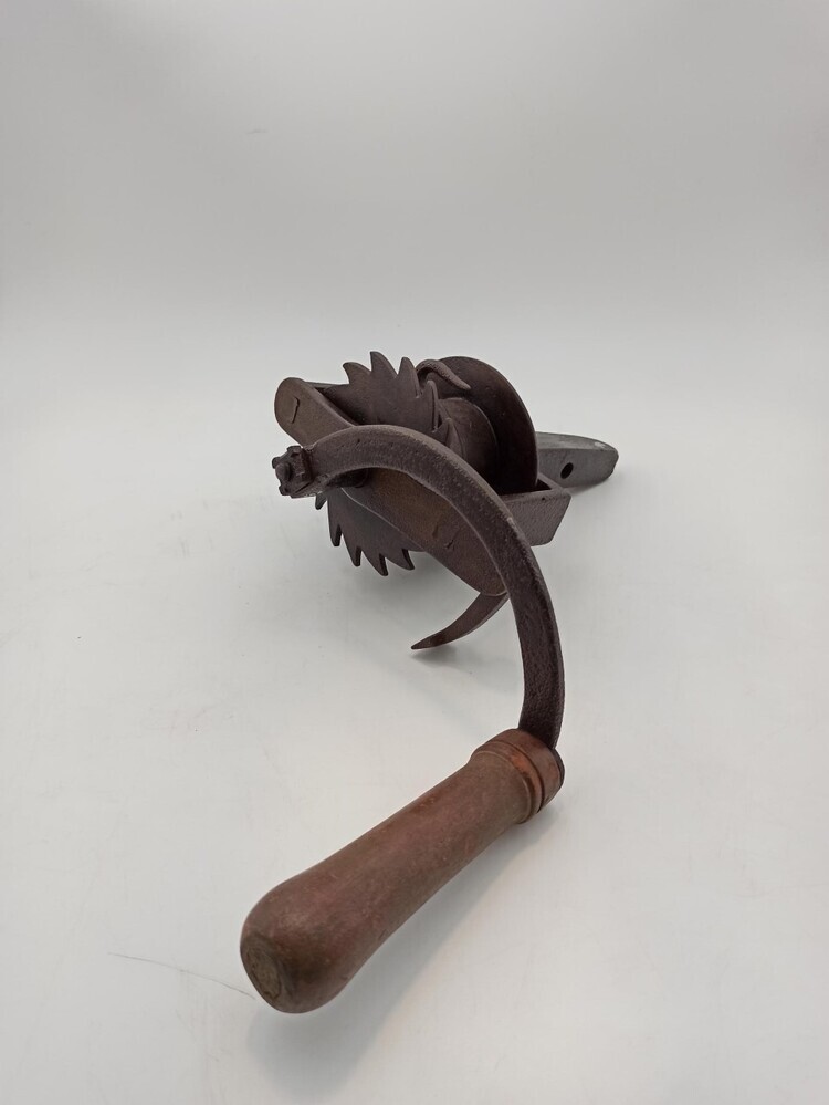 Draailier met zwengel. De klos heeft een vlak met een tandwiel en een glad wiel en zit in een vierkant ijzeren frame, aan een vierkante staaf met een gat. Langs het tandwiel een stopper en op de klos is een haak geklonken. De zwengel is boogvormig en heeft een houten handgreep. Op de stamkaart: bruikleennummer ...