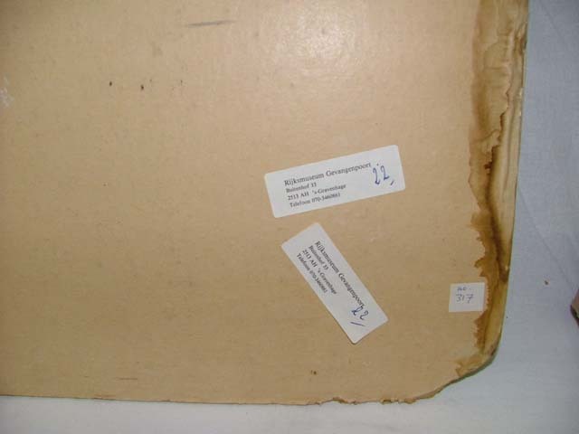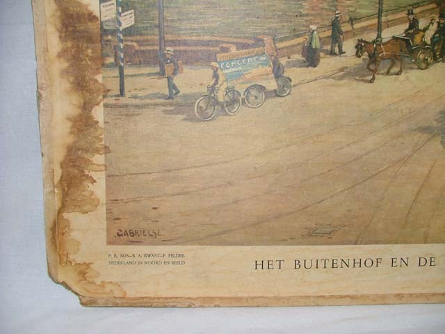 Gekleurde prent op strokarton met voorstelling van het Buitenhof met rechts de Gevangenpoort en links het Binnenhof. Onder de prent de titel 'Het Buitenhof en de Gevangenpoort te 's-Gravenhage'. Uit de serie van P.R. Bos - B.A. Kwast - F. Helder, Nederland in woord en beeld. Rechts staat de uitgever 'J.W. Wolters'. Op de stamkaart ...
