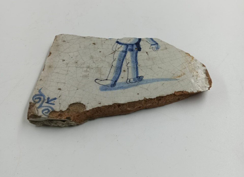 Beschadigde wit geglazuurde tegel van aardewerk met een mannenfiguur.