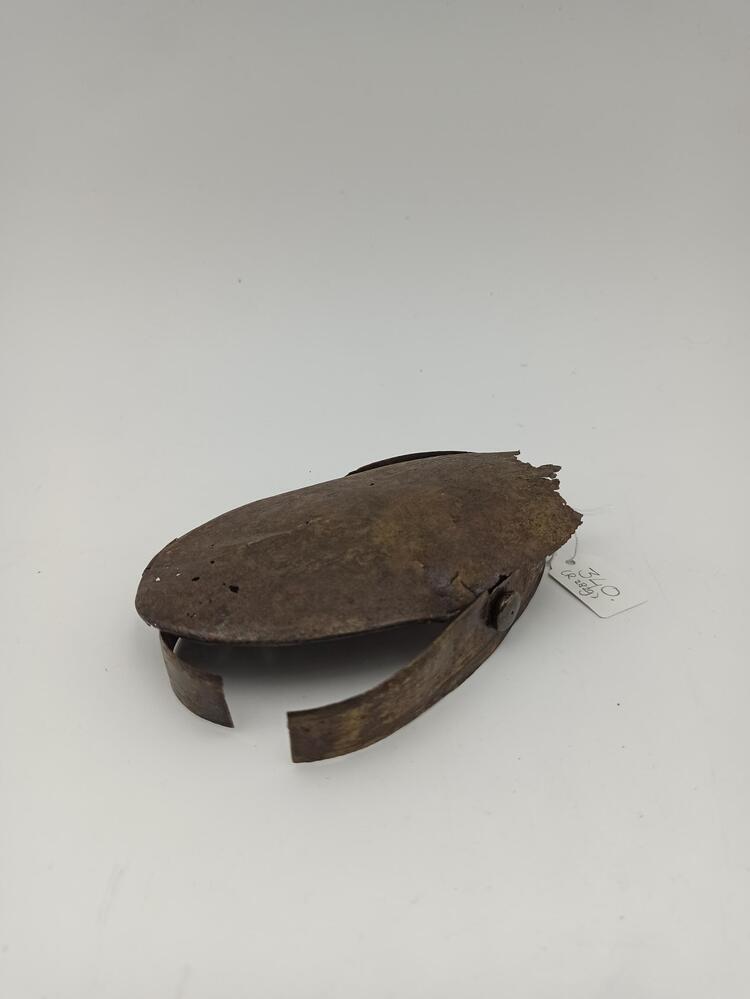 Ovale, platte tabaksdoos van koper met een deksel met aan de voorzijde een knop en aan de achterzijde een scharnier. Op het deksel een afbeelding van een ploegende boer met vee en hooimijten, en een onleesbare tekst.
