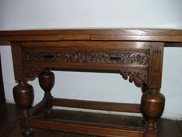 Kruisvoettafel met bolpoten, een klaptafelblad en met in het fries een lade met sleutelgat. Op de stamkaart: Een negentiende eeuwse tafel waarbij gebruik gemaakt is van diverse 17e eeuwse onderdelen.