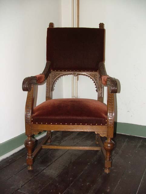 Eikenhouten stoel met donker rode velours bekleding op de zitting, de rug en de armleggers. De stoel is voorzien van snijwerk in de vorm van twee leeuwen en staat op bolpoten.