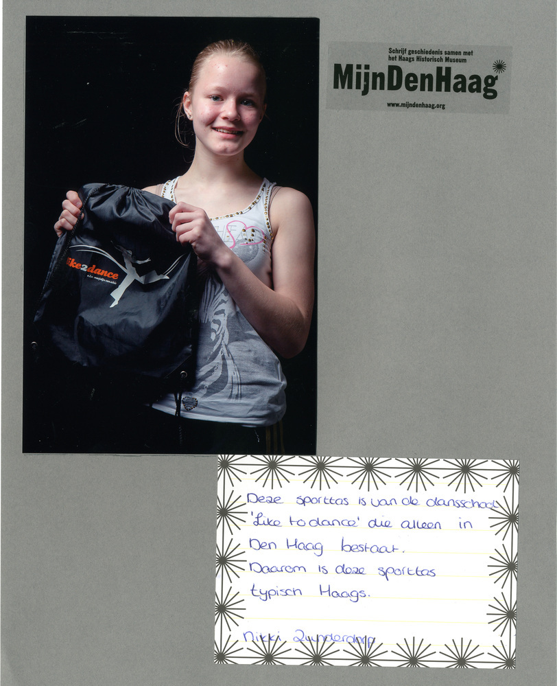 Dit verhaal maakt onderdeel uit van het project MijnDenHaag* Topstukken, waarbij Hagenaars gevraagd wordt naar hun eigen persoonlijke topstuk. 'Deze sporttas is van de dansschool ‘Like to dance’ die alleen in Den Haag bestaat. Daarom is deze sporttas typisch Haags. Nikki Zunderdorp Deze MijnDenHaag* deelnemer is leerling van Theaterschool Rabarber.'