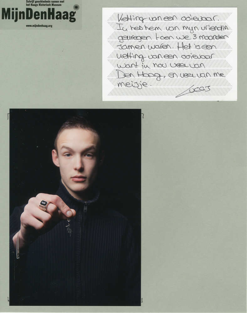 Dit verhaal maakt onderdeel uit van het project MijnDenHaag* Topstukken, waarbij Hagenaars gevraagd wordt naar hun eigen persoonlijke topstuk. 'Ik heb deze ketting van mijn vriendin gekregen toen we drie maanden samen waren. Het is een ketting met een ooievaar, want ik houd veel van Den Haag en veel van mijn meisje. Lucas'