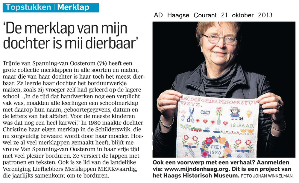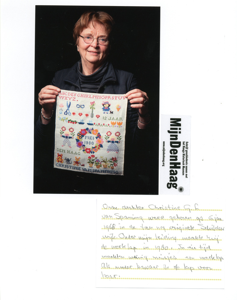 Dit verhaal maakt onderdeel uit van het project MijnDenHaag* Topstukken, waarbij Hagenaars gevraagd wordt naar hun eigen persoonlijke topstuk. 'Onze dochter Christine G.L. van Spanning werd geboren op 6 januari 1968 in de toen nog originele Schilderswijk. Onder mijn leiding maakte zij de merklap in 1980. In die tijd maakten weinig meisjes een merklap. Als ...