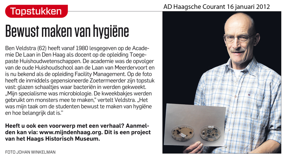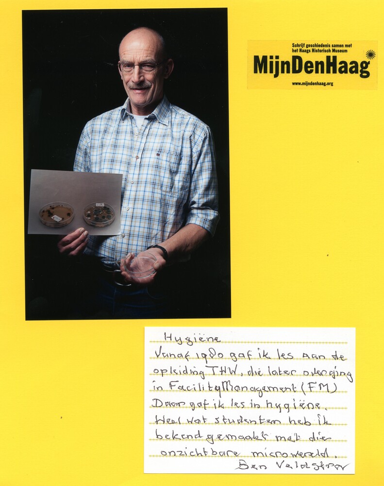 Dit verhaal maakt onderdeel uit van het project MijnDenHaag* Topstukken, waarbij Hagenaars gevraagd wordt naar hun eigen persoonlijke topstuk. 'Hygiëne. Vanaf 1980 gaf ik les aan de opleiding THW (Toegepaste Huishoudwetenschappen), die later overging in Facility Management (FM). Daar gaf ik les in hygiëne. Heel wat studenten heb ik bekend gemaakt met die onzichtbare microwereld. ...