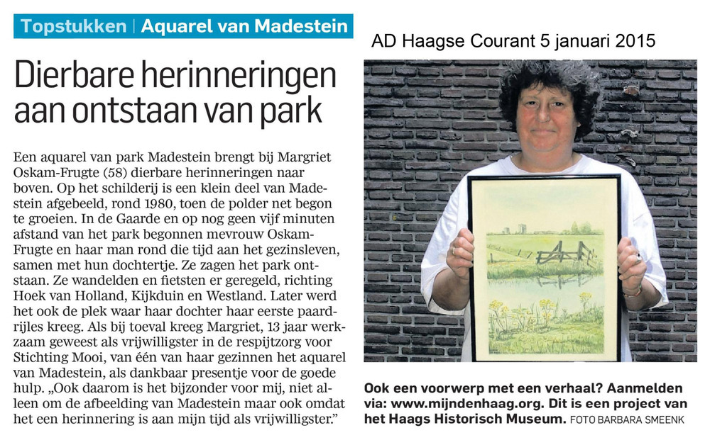 Dit verhaal maakt onderdeel uit van het project MijnDenHaag* Topstukken, waarbij Hagenaars gevraagd wordt naar hun eigen persoonlijke topstuk. '1980; Madestein park/polder begint te groeien... ...de rest van de bomen en planten worden geplant in de buurt van en richting wateringen. Met mijn man beginnen we aan ons gezin. In de Gaarde wandelen en fietsen ...
