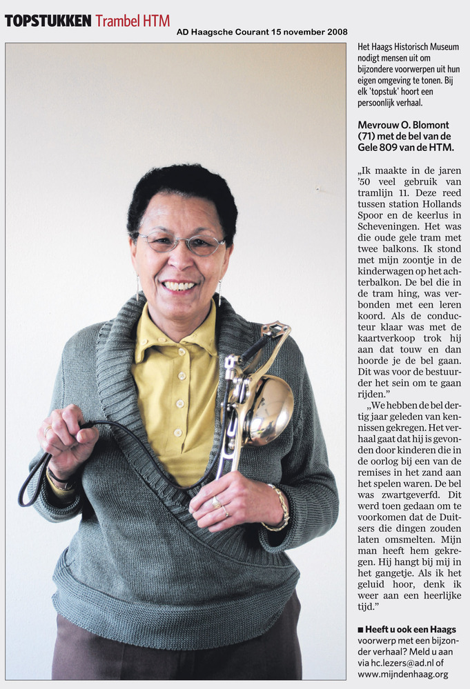 Dit verhaal maakt onderdeel uit van het project MijnDenHaag* Topstukken, waarbij Hagenaars gevraagd wordt naar hun eigen persoonlijke topstuk. '“De Goede oude tijd” Deze trambel werd gebruikt op tramlijn 11 van de HTM (Haagsche Tramweg Maatschappij). Deze lijn ging van het station Den Haag Holland Spoor naar Scheveningen. In de jaren 1954 tot en met ...