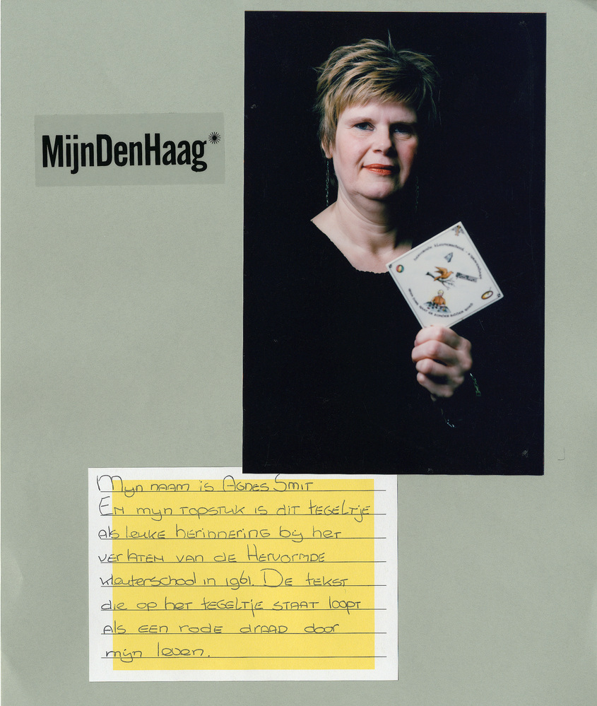 Dit verhaal maakt onderdeel uit van het project MijnDenHaag* Topstukken, waarbij Hagenaars gevraagd wordt naar hun eigen persoonlijke topstuk. 'Mijn naam is Agnes Smit. En mijn topstuk is dit tegeltje als leuke herinnering bij het verlaten van de Hervormde kleuterschool in 1961. De tekst die op het tegeltje staat loopt als een rode draad door ...