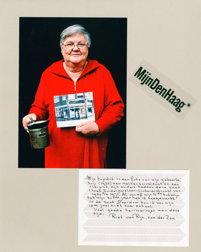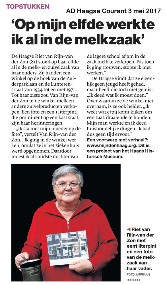 Dit verhaal maakt onderdeel uit van het project MijnDenHaag* Topstukken, waarbij Hagenaars gevraagd wordt naar hun eigen persoonlijke topstuk. 'Mijn topstuk is een foto van mijn geboorte huis (1936), een melk- en zuivelzaak en een 1 liter pint. Mijn ouders hadden deze zaak (hoek Zuiderparklaan-Lunterenstraat) van 1934 t/m 1971. Al vanaf mijn 11de jaar tot ...