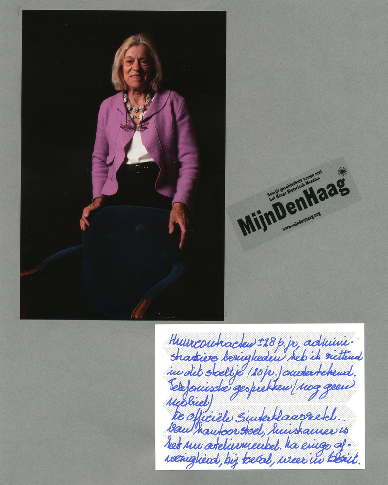 Dit verhaal maakt onderdeel uit van het project MijnDenHaag* Topstukken, waarbij Hagenaars gevraagd wordt naar hun eigen persoonlijke topstuk. 'Huurcontracten +/- 28 per jaar, administratieve bezigheden heb ik zittend in dit stoeltje (20 jaar) ondertekend. Telefonische gesprekken (nog geen mobiel). De officiële Sinterklaaszetel. Van kantoorstoel, huiskamer, is het nu ateliermeubel. Na enige afwezighed, bij toeval, ...